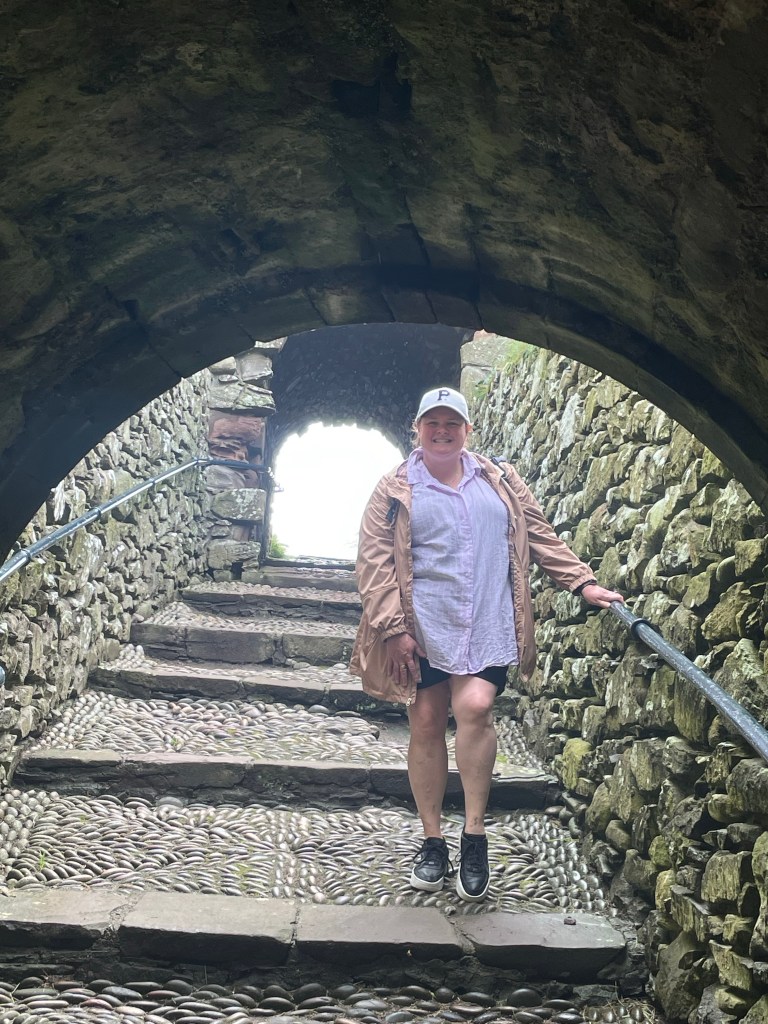 In the afternoon we finally made it to Mønsted Limestone Mines. Even though it was summer in Denmark, we knew that the “hiking” we were about to do that day would be in a much cooler environment. Once we got our tickets we took off on a walk to the entrance! The sidewalk path led us to a wooden bridge that went into a forested area. It was very pretty and relaxing, and we liked the idea of being somewhat elevated from the forest floor. Overall, the path wasn’t too long, and we arrived at the mine entrance in no time.